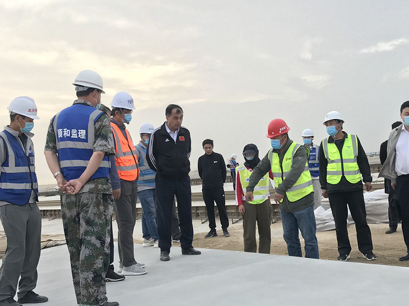 在施工現(xiàn)場(chǎng),吐爾遜江·阿合買提一行聽取了項(xiàng)目復(fù)工達(dá)產(chǎn)、疫情防控以及文明施工等方面的情況匯報(bào)。在實(shí)際觀摩現(xiàn)場(chǎng)工人作業(yè)和跑道感觀質(zhì)量后,吐爾遜江·阿合買提對(duì)項(xiàng)目進(jìn)展和工程質(zhì)量控制表示滿意,鼓勵(lì)建設(shè)者要繼續(xù)努力不放松,確保防疫和生產(chǎn)同步同向,助力于田打贏脫貧攻堅(jiān)戰(zhàn)。