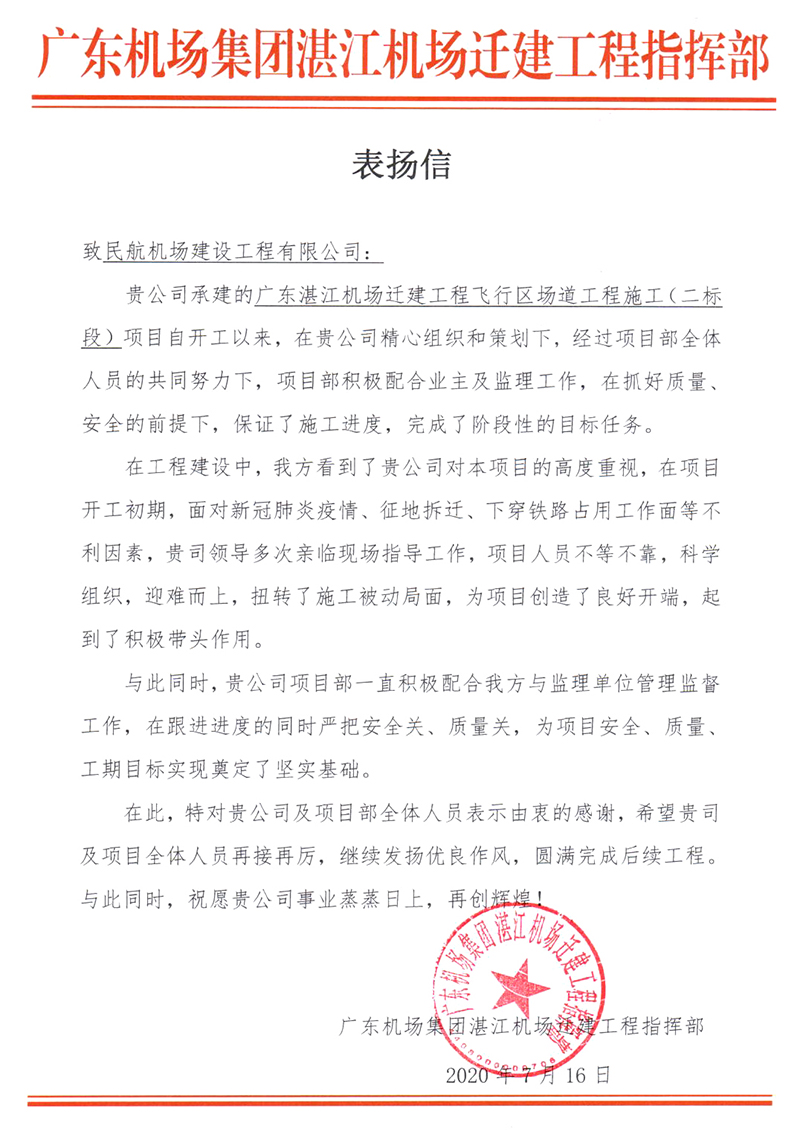 7月16日,第十六總經(jīng)理部承建的廣東湛江機(jī)場(chǎng)遷建工程飛行區(qū)場(chǎng)道工程施工(二標(biāo)段)項(xiàng)目,收到來(lái)自廣東機(jī)場(chǎng)集團(tuán)湛江機(jī)場(chǎng)遷建工程指揮部發(fā)來(lái)的表?yè)P(yáng)信。