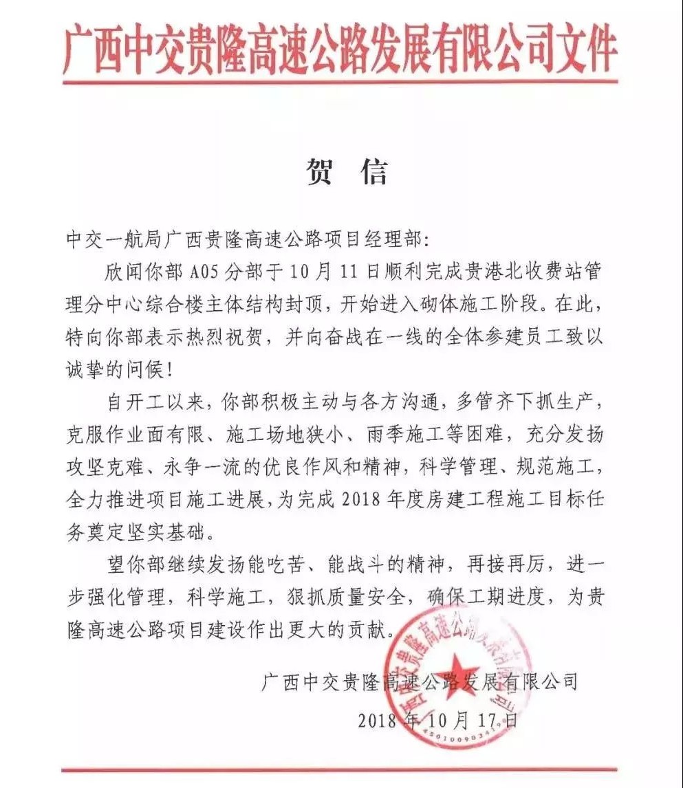 10月17日,公司第一項目部承建的廣西貴隆高速公路房建項目獲得業(yè)主單位廣西中交貴隆高速公路發(fā)展有限公司致信表揚。