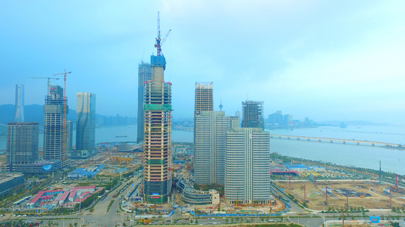 中交匯通橫琴廣場工程是中國交建首個超高層高端城市綜合體開發(fā)項目,集5A甲級辦公、總部式辦公、餐飲、展示、住宅等功能為一體。地上部分由2棟公寓樓住宅、1棟辦公塔樓及3棟商業(yè)裙房組成。本次驗收的2棟公寓樓結(jié)構(gòu)形式均為剪力墻結(jié)構(gòu),其中,1號公寓樓37層,結(jié)構(gòu)高度119.7米;2號住宅樓30層,結(jié)構(gòu)高度97.65米。