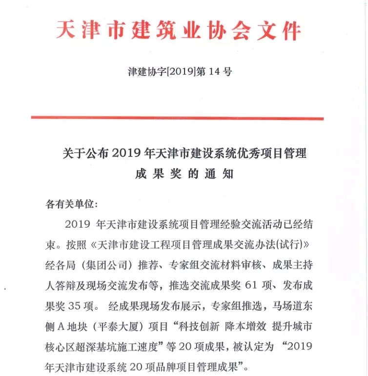 公司喜獲“2019年天津市建筑系統(tǒng)優(yōu)秀項(xiàng)目管理成果獎”