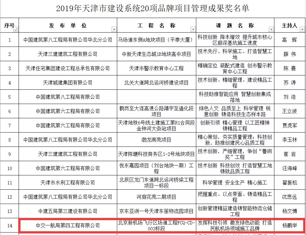 4月23日,公司選送的《發(fā)揮科技引領(lǐng) 激發(fā)綠色動能 打造民航機(jī)場領(lǐng)域施工品牌》管理成果,被天津市建筑業(yè)協(xié)會評為“2019年天津市建設(shè)系統(tǒng)20項(xiàng)品牌項(xiàng)目管理成果”。