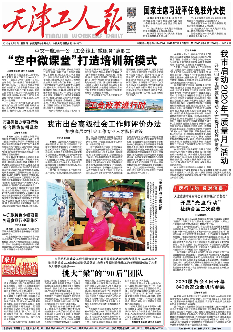 9月3日,《天津工人報》頭版“來自基層的報道”欄目,以《挑大“梁”的“90后”團隊》為題,對公司第十五總經(jīng)理承建的達州機場大道項目1號預制梁場施工班組事跡進行了專題報道。