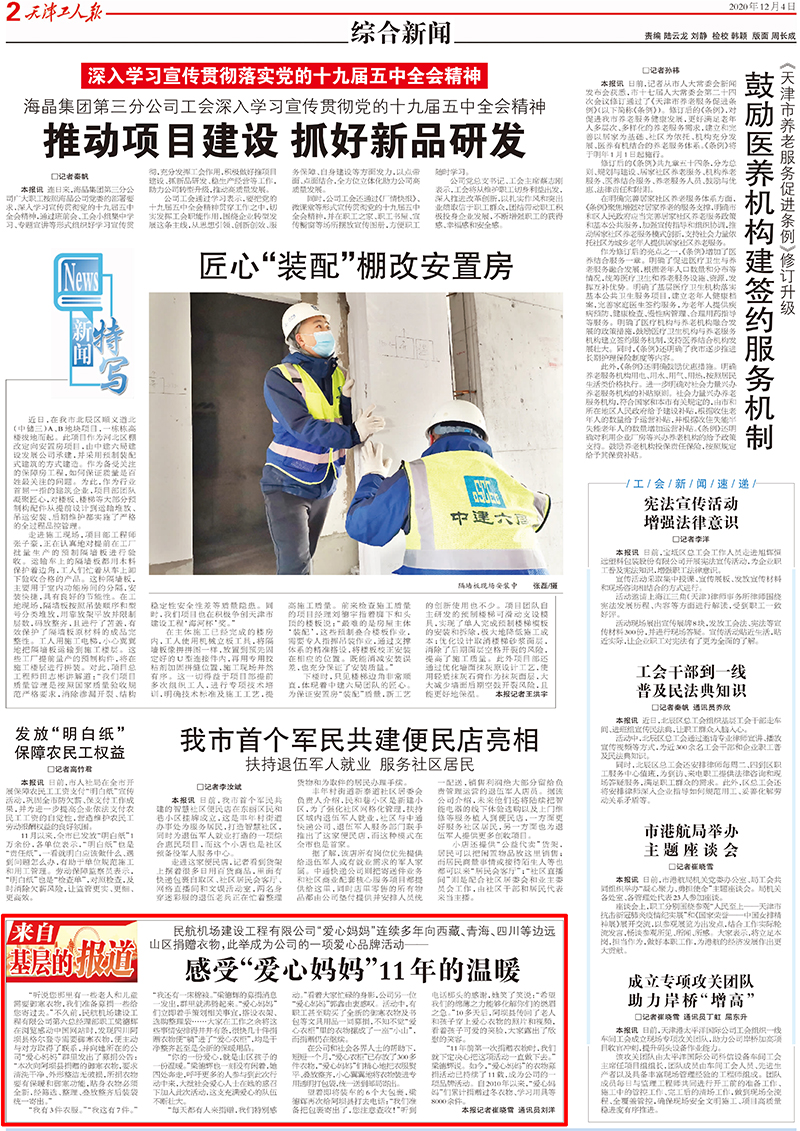 12月4日,《天津工人報》第10464期2版“來自基層的報道”欄目,以《感受“愛心媽媽”11年的溫暖》為題,報道了“民航建工媽媽群”連續(xù)11年向四川、西藏、青海等高寒地區(qū)募捐御寒衣物活動的感人事跡。