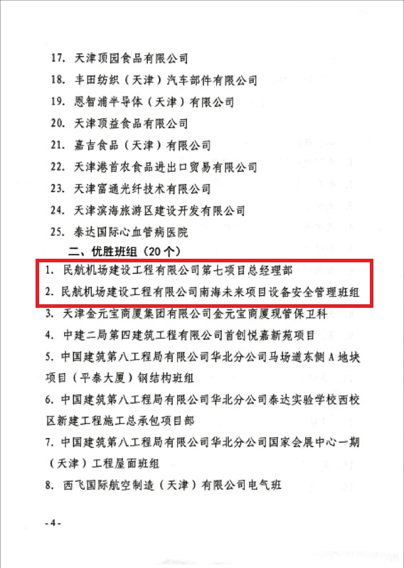 近日,由天津市濱海新區(qū)總工會、濱海新區(qū)經(jīng)濟管理局、濱海新區(qū)衛(wèi)生健康委員會聯(lián)合開展的2019-2020年度天津市濱海新區(qū)“安康杯”競賽落下帷幕,公司第五總經(jīng)理部南海未來城項目設備安全管理班組和第七總經(jīng)理部分獲2019-2020年度天津市濱海新區(qū)“安康杯”競賽優(yōu)勝班組榮譽稱號。