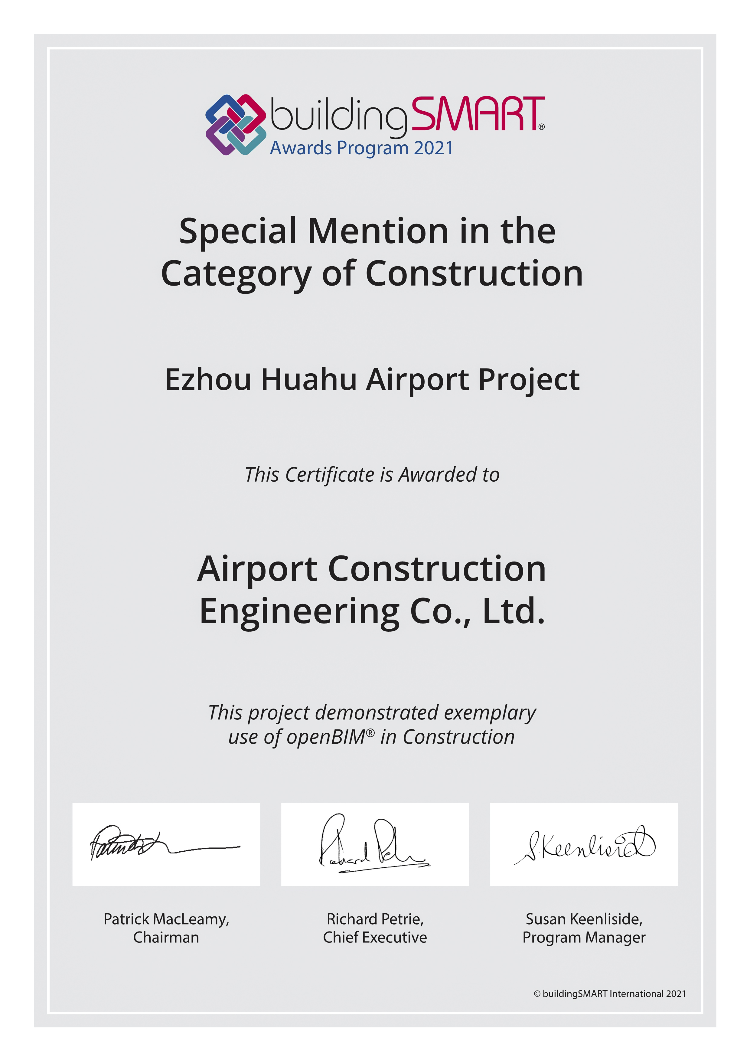 今年,全球共有來自20多個國家133個項目申報了該獎項,最終25個項目入圍。經(jīng)國際大獎賽組委會初審、國際評委團打分后,評選出8個優(yōu)勝項目,6個榮譽提名項目。其中由公司參與申報的鄂州花湖機場項目順利獲得施工組榮獲提名獎,標志著本項目的BIM技術(shù)應(yīng)用得到了國際權(quán)威組織和專家的認可。