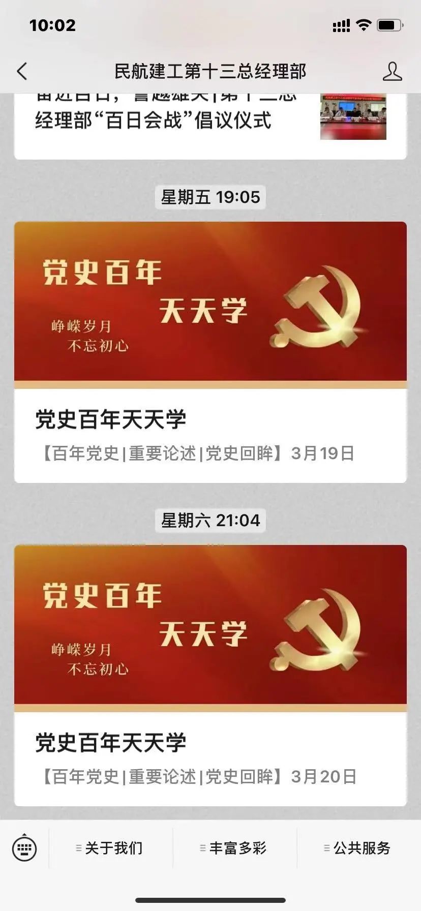 公司各基層單位通過開展形式多樣的宣貫活動,認真?zhèn)鬟_落實公司黨史學習教育動員部署會精神,第二總經(jīng)理部黨員代表在總經(jīng)理部黨史學習教育動員部署會上宣讀《學黨史 守初心 奮進新時代,為建黨100周年貢獻力量》倡議書。積極運用微信、微博、學習強國、官網(wǎng)等企業(yè)自媒體矩陣,在公司及所屬各單位微信開設(shè)“我是黨員我?guī)ь^”“學黨史、慶百年”“黨史白年天天學”等專欄,定期編發(fā)黨史學習教育工作相關(guān)題材的圖文和視頻,多措并舉營造濃厚學習氛圍。